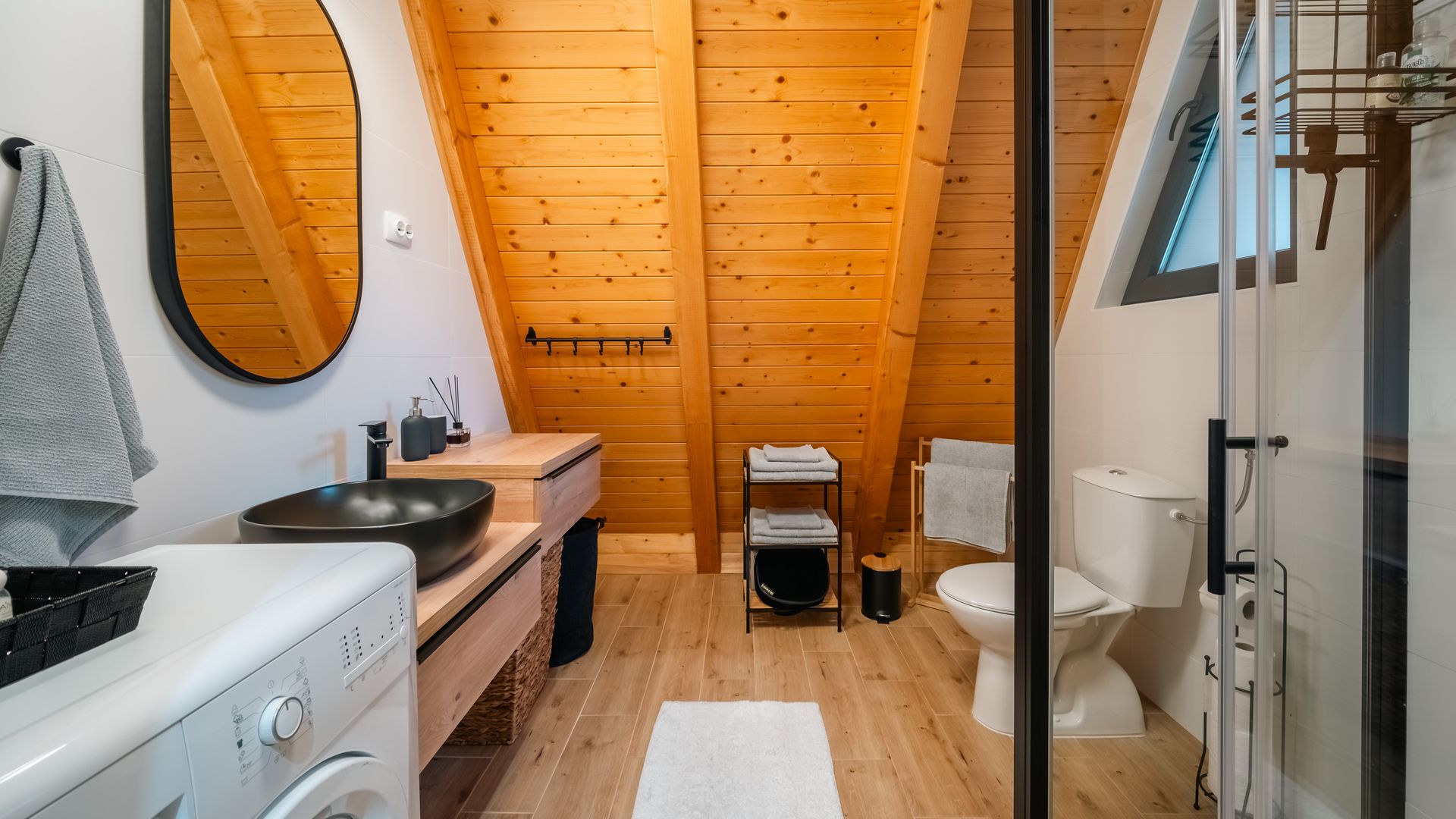 A wooden A-Frame house, which is reminiscent of a luxurious mountain cabin, is located in greenery, close to a hot spring.
