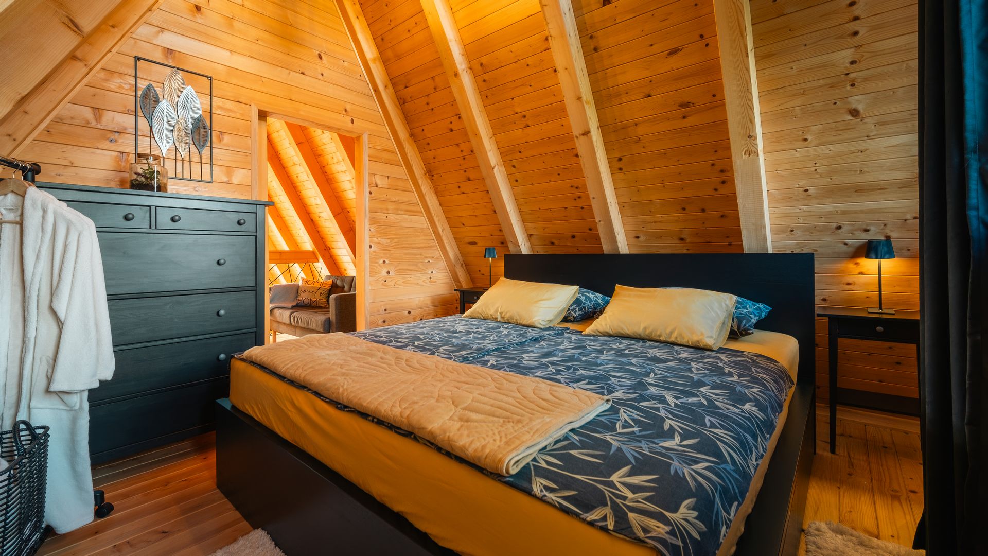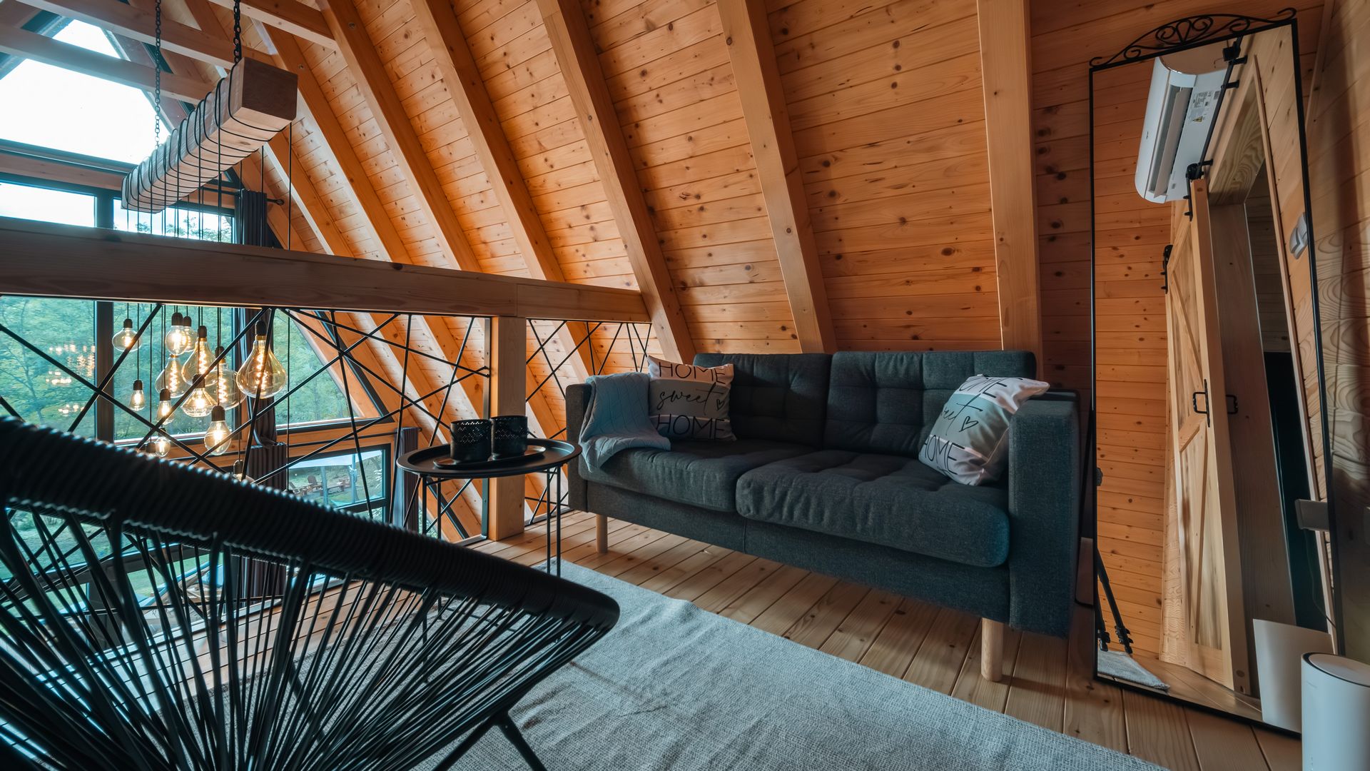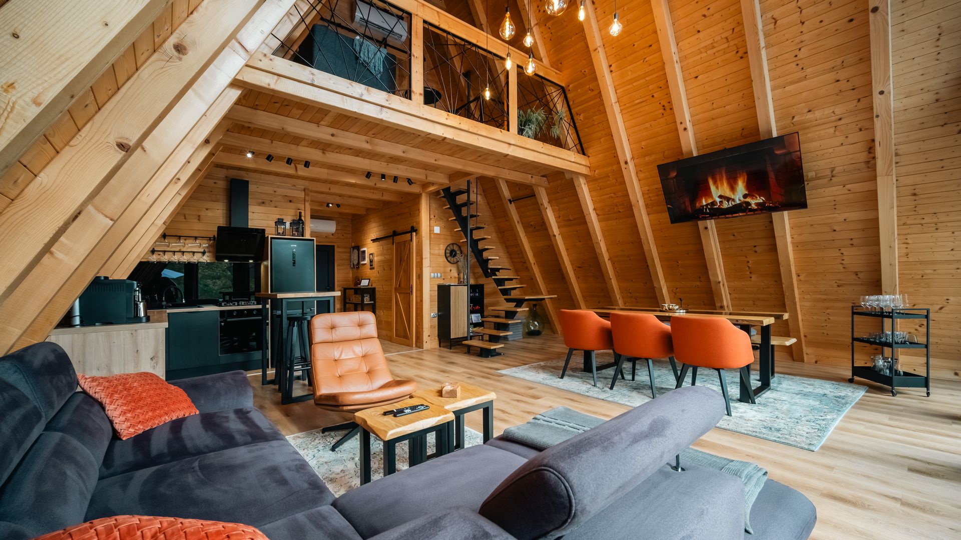 Drvena A-Frame kuća, koja izgledom podsjeća na luksuznu planinsku kolibu, smještena je u zelenilu, nedaleko od izvora termalnih voda.